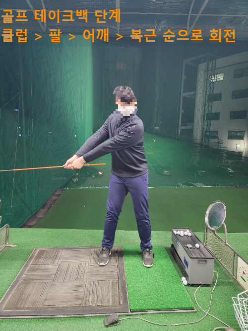 백스윙의 순서는 내 몸에서 가장 먼 위치에 있는 것부터 시작을 한다고 생각하면 됩니다. 위에 몸의 움직임과 같이 위에서 아래로 비틀어지는 기본으로 생각하면 됩니다. 그러나 맨몸이 아닌 골프 스윙을 할 때에는 골프 클럽을 잡고 움직이기 때문에 그 부분만 추가가 되면 됩니다.