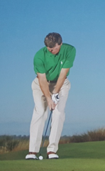 골프 어드레스에서 발의 보폭(스탠스)은 거리에 비례하게 넓이를 잡습니다. 칩샷의 경우 30M 이내의 샷이므로, 짧은 거리에 맞게 발의 보폭은 어깨너비 보다 좁게 섭니다. 양발의 모양은 11자로 서도 되고, 왼발만 뒤로 살짝 빼주는 오픈 스탠스를 취합니다. 또한 칩샷은 짧은 거리에서 하기 때문에 몸의 흔들림과 불필요한 움직임을 줄이기 위해 왼발에 체중을 60% ~ 70% 실어줍니다. 그렇게 되면 그립의 위치도 왼쪽 허벅지 쪽으로 기울게 되어 팔의 모양이 소문자 y모양으로 위치합니다.