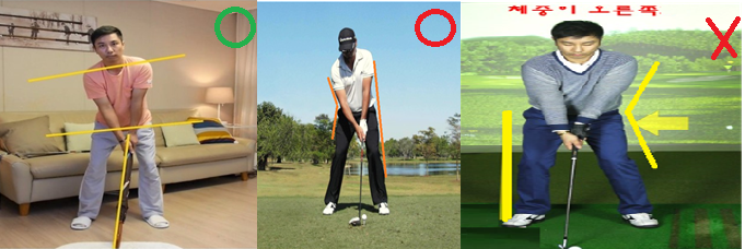 이런 동작으로 인해서 오히려 잘못된 동작의 오류를 만드는 원인이 됩니다. 그로 인해 다양한 형태로 나타나게 됩니다. 골프 임팩트 자세에서 체중이동은 물론 중요합니다. 그러나 골프 어드레스에서도 마찬가지로 올바른 체중 분배를 하여야 체중 이동 또한 잘할 수 있습니다.