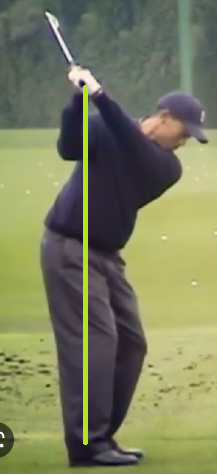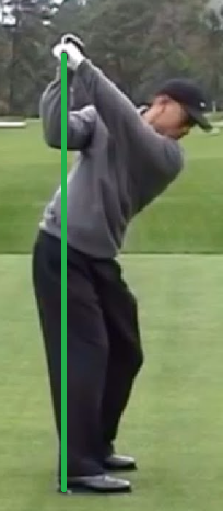 완성된 백스윙 탑 모양에서 그립의 위치에 수직라인을 긋게 되면 보통은 오른발 복숭아 뼈에서 뒤꿈치 선상까지 위치하게 됩니다. 길고 멀리 보내는 골프 클럽일수록 그립의 위치가 뒤꿈치 이상 넘어가야 하며, 아이언 및 짧은 클럽의 경우는 최소 복숭아 뼈가 있는 직선상까지는 위치해야 합니다.